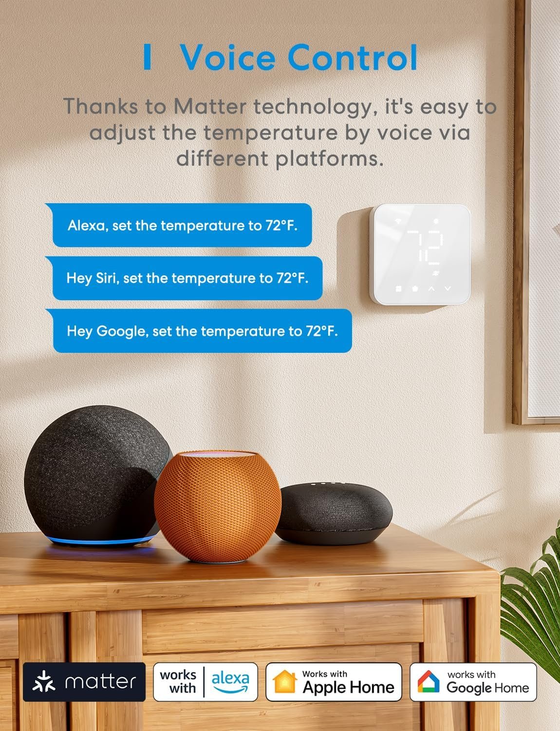 The meross Smart Thermostat (MTS300) offers seamless integration with major smart home platforms, including Apple Home, Amazon Alexa, Google Assistant, and SmartThings, thanks to its Matter compatibility. With a sleek glass touch panel, it provides intuitive control and a 7×24-hour customizable schedule to optimize energy usage. Monitor and adjust your home's temperature remotely via the Meross app, ensuring comfort and efficiency year-round.